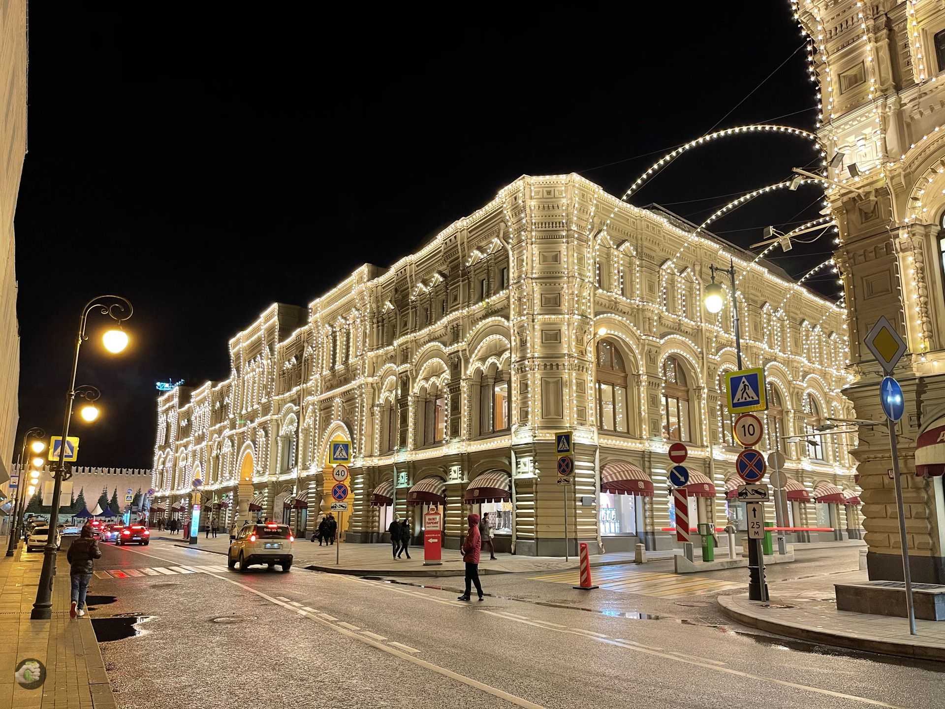 Примерно 22:00. Повторюсь, камера ночью ведёт себя подозрительно, алгоритмы наверняка будут править много-много раз. Но вот здесь ГУМ как положено!