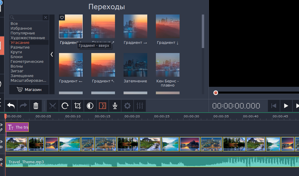 В меню слева отыщите «Переходы». Установите переходы между фото. Они могут быть одинаковыми или разными — выбирайте тот вариант, что понравиться. В открывшемся окне выберите стиль переходов, например, «угасание». Перетащите переход на видеотрек и расположите между фото.