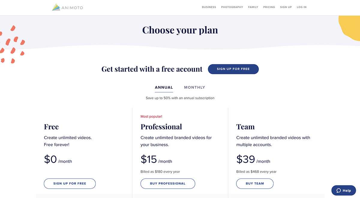 - Профессиональный план за 15 долларов в месяц открывает вам дизайнерские ресурсы и не использует бренд Animoto.