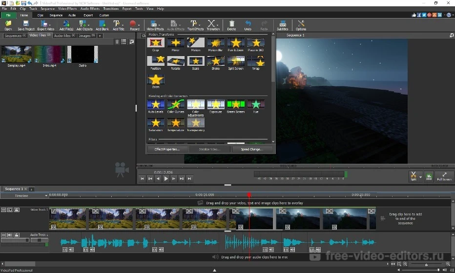 Если говорить про лучшие бесплатные видеоредакторы на русском языке, то VideoPad возглавляет этот список. Его функционал достаточен как для опытного пользователя, так и прост для изучения новичком видеомонтажа. Программа справляется с простейшими задачами: накладывание аудио, создание эффектов перехода, изменение скорости воспроизведения и др. Также хорошо подходит и для более сложных операций: поддерживает работу с хромакеем и рендеринг для популярных площадок и устройств.