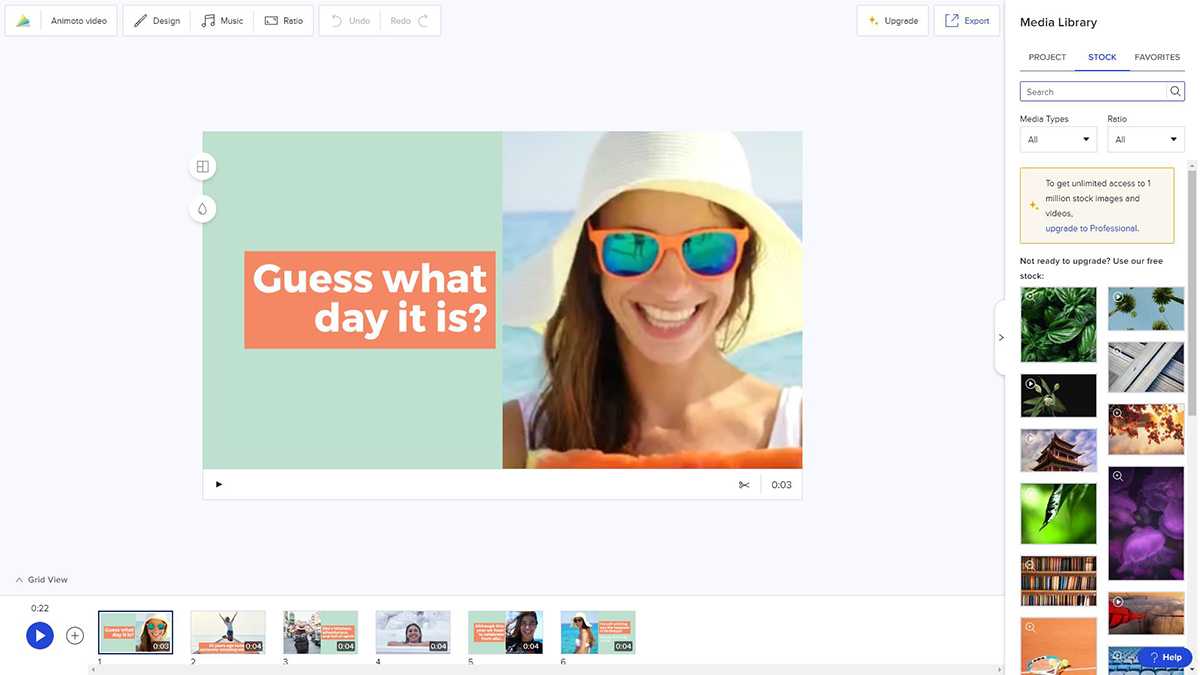 Animoto — еще одна альтернатива Biteable, которая позволяет пользователям объединять фотографии и клипы для создания привлекательных видеороликов и презентаций. Стандартные функции абсолютно бесплатны для всех, от студентов до фрилансеров и предприятий любого размера.