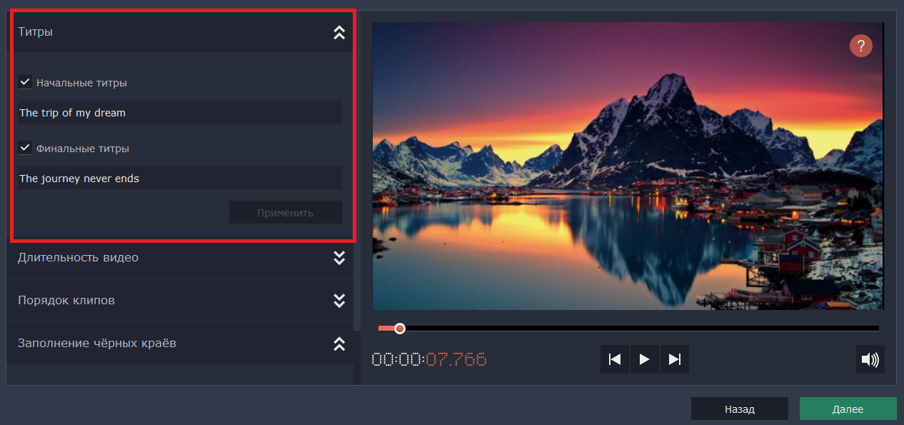 Нажмите «Просмотр»: запустится ролик с фото и стандартный для темы «Путешествие» трек. В блоке слева можно написать начальные и финальные титры. Для сохранения данных нажмите «Применить».