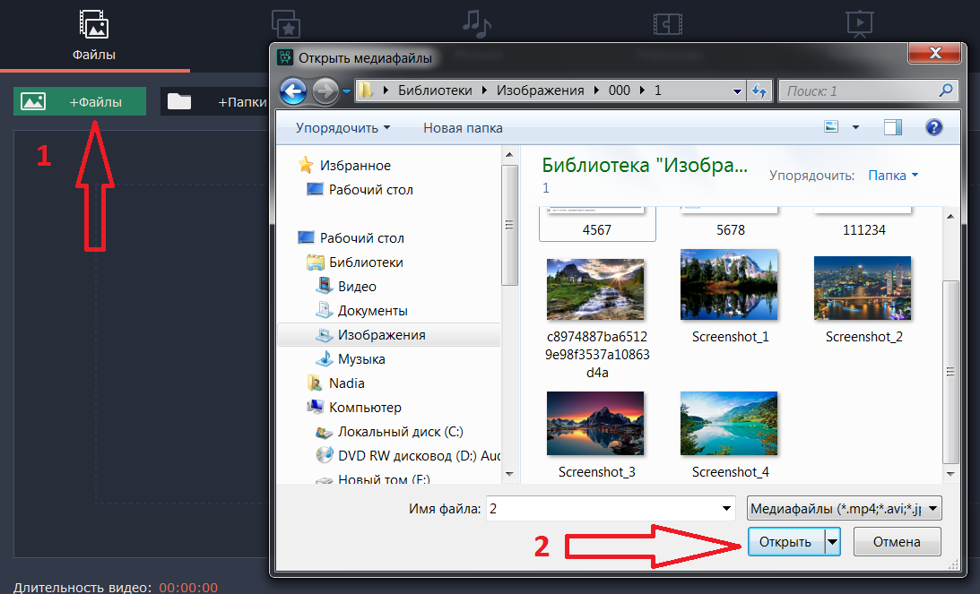 В интерфейсе программы находим «Добавить файл». После нажатия пиктограммы откроется диалоговое окно. В нем выбираете необходимые для ролика фото для вашего видеоролика. Также можно перетащить фото из папки непосредственно в рабочую область программы Movavi. Затем изображения можно переставлять местами. Все загруженные файлы автоматически попадут на Видеотрек.![]()