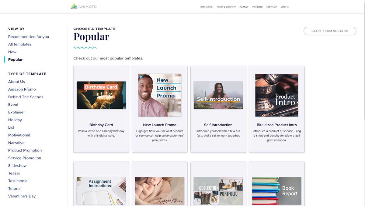 У Animoto есть приличная коллекция шаблонов видео в нескольких категориях. Большинство шаблонов предназначены для социальных сетей, таких как анимированные цитаты, промо и закулисные видео.