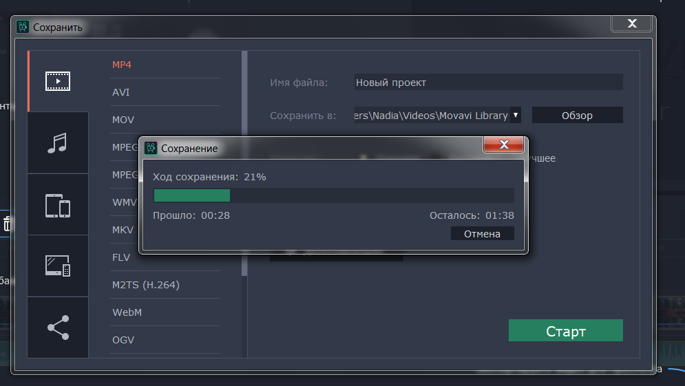 Сохранить ролик можно в любом доступном формате, например, в mp4.