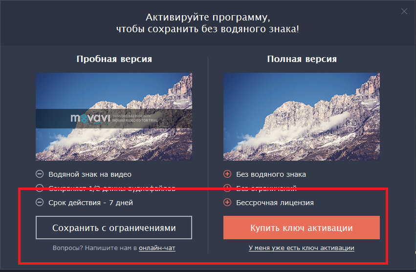 Если вы желаете использовать бесплатную версию программы, ваш ролик будет иметь водяной знак Movavi. В случае приобретения платной лицензии вы сможете использовать программу без ограничений во времени и без водяных знаков.