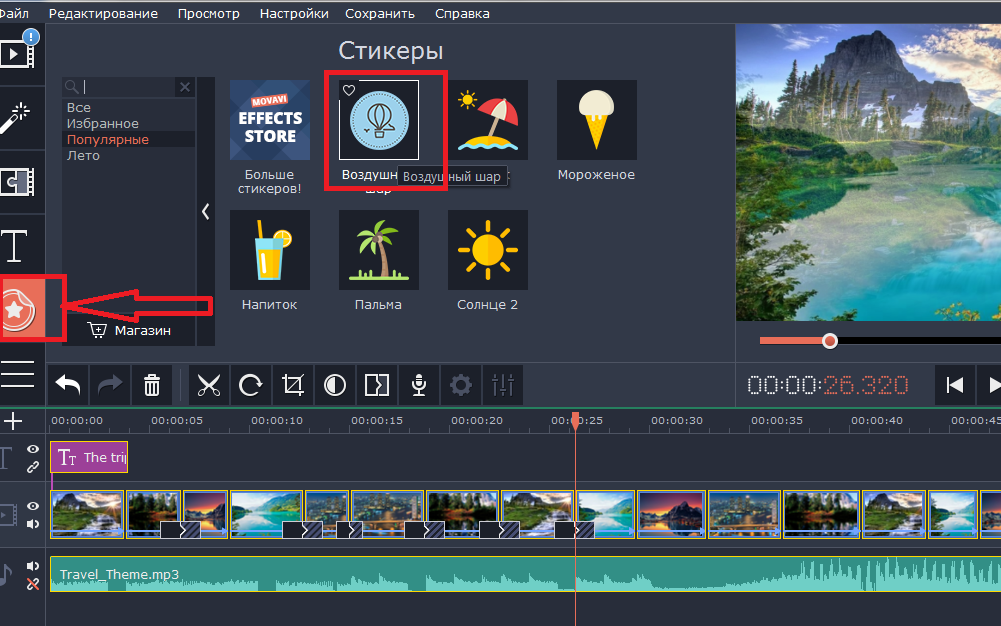 Также можно вставить стикеры в ролик, например, «воздушный шар».