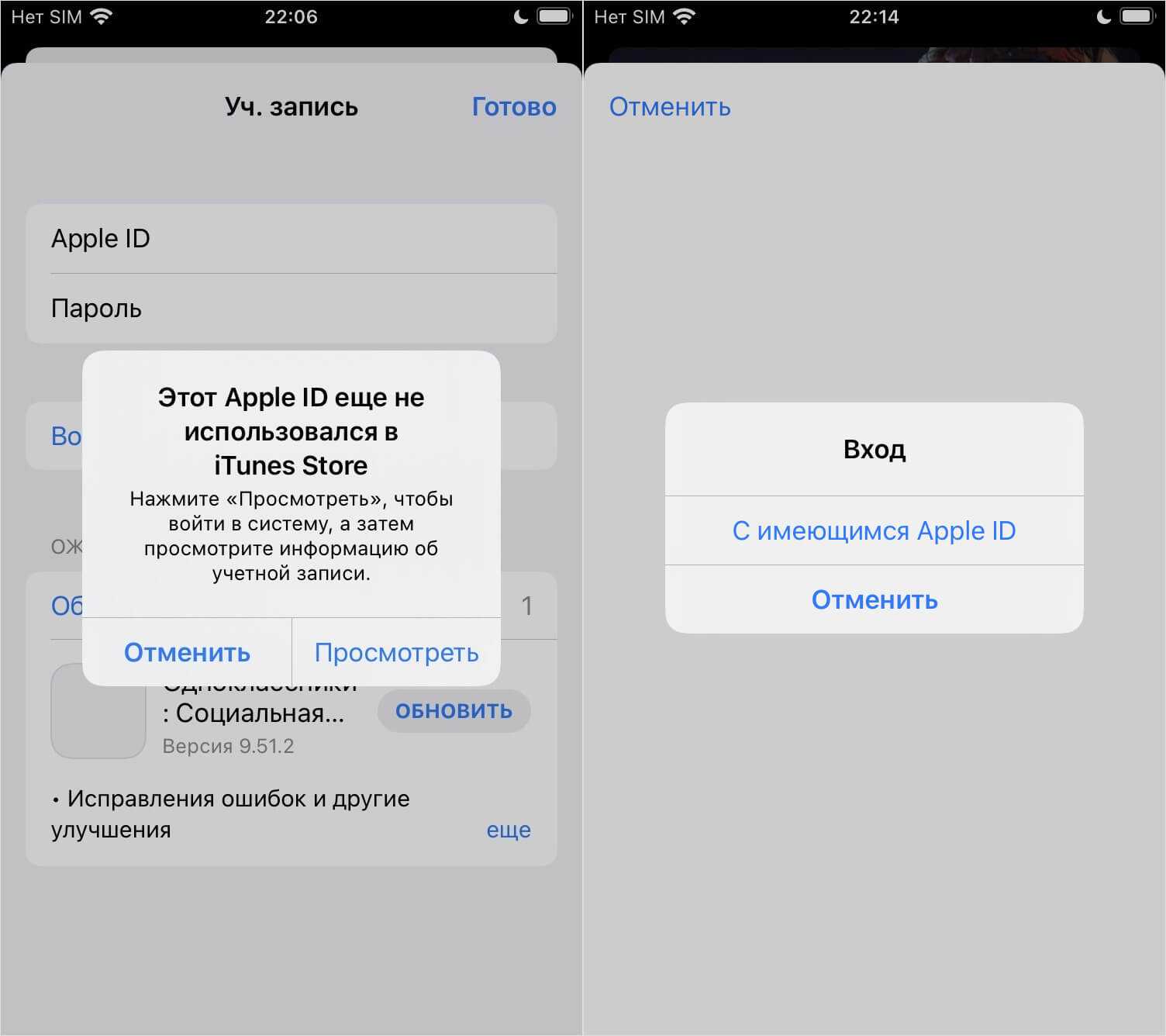 При попытке скачать приложение на экране появилось сообщение «Этот Apple ID еще не использовался в iTunes», а снизу были две кнопки — «Отменить» и «Просмотреть». При нажатии на вторую сразу же перекидывает на страницу авторизации iTunes, где нужно ввести логин и пароль от Apple ID, после чего система возвращает обратно в App Store с той же ошибкой. Причин происходящего всего две.