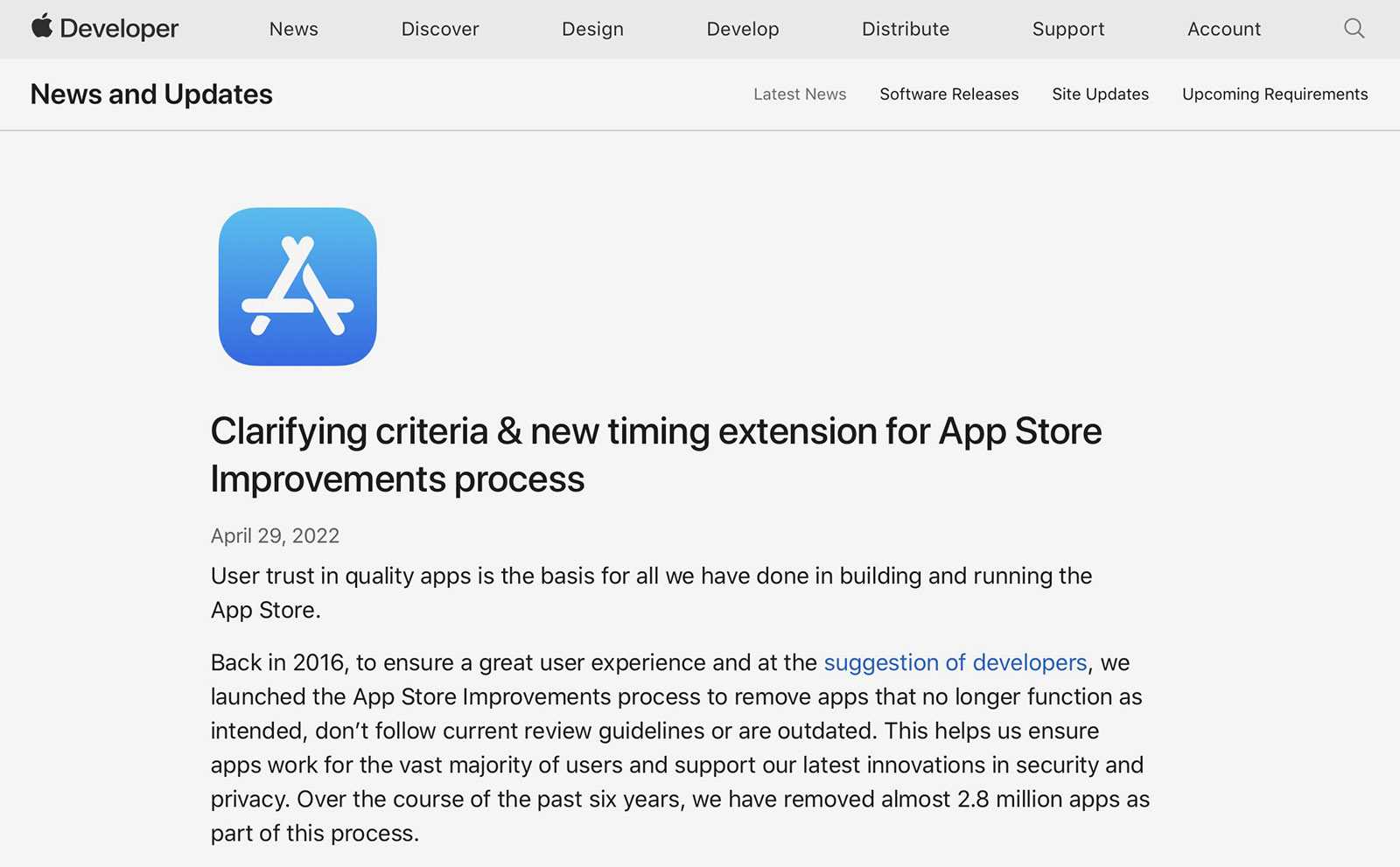 Эта инициатива называется «Улучшение App Store» (App Store Improvements). Её запустили в 2016 году после многочисленных жалоб пользователей и разработчиков на устаревшие приложения, захламляющие App Store и поиск по нему.