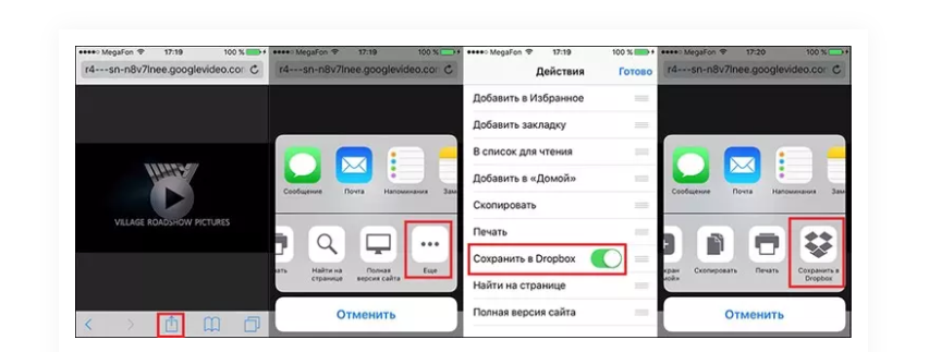 Еще проще загрузить медиа через утилиты Dropbox и SaveFrom.net, практикуя их одновременное применение. Для этого необходимо создать учетную запись в облачном сервисе, выбрать нужное видео на хостинге и кликнуть по кнопке «Поделиться», перейти к утилите SF и вставить в ее адресную строку скопированную ссылку.
