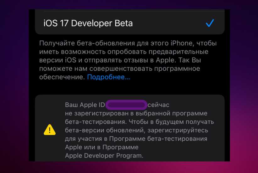 Apple совершенствуется и теперь видит тех, кто устанавливает бета-версии прошивок iOS 17 без регистрации в Apple Developer Program для разработчиков и без регистрации в программе бета-тестирования Apple. Для таких в разделе Настройки > Основные > Обновление ПО > Бета-обновления теперь появляется надпись: «Ваш Apple ID сейчас не зарегистрирован в выбранной программе бета-тестирования. Чтобы в будущем получать бета-версии обновлений, зарегистрируйтесь для участия в программе бета-тестирования Apple или в программе Apple Developer Program». После установки первой бета-версии iOS 17 эта надпись пропадет.