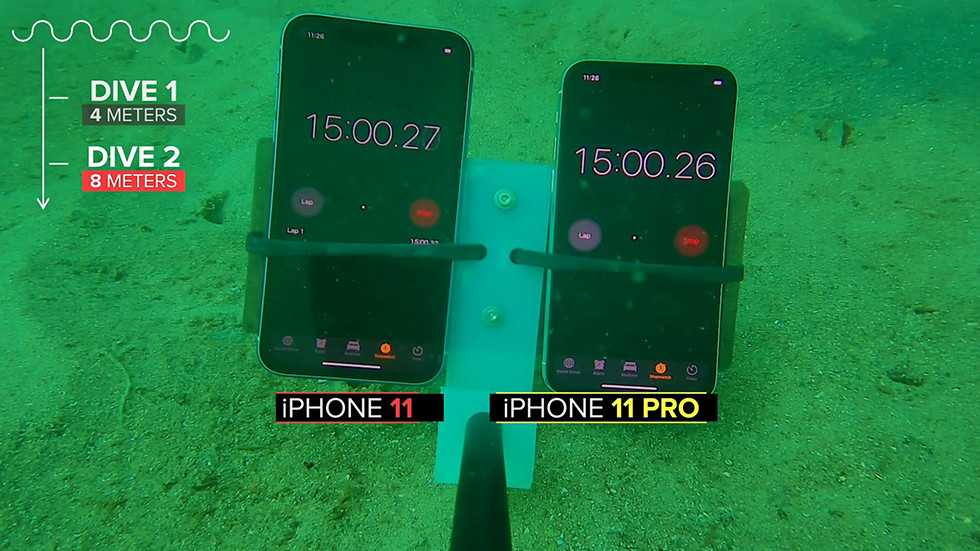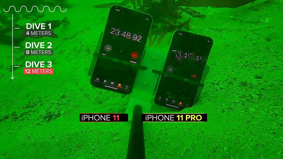 Сперва смартфоны были погружены на глубину 4 метра на 30 минут. Стандарт защиты iPhone 11 Pro от воды — IP68. Официально устройство способно выдерживать именно такое погружение. Степень защиты iPhone 11 такая же — IP68, но, согласно спецификациям, смартфон может погружаться на глубину до двух метров.
