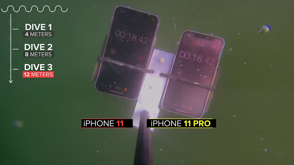 В третий раз смартфоны были погружены на глубину 12 метров. Это в шесть раз превышает глубину, предусматриваемую рейтингом защиты iPhone 11, и в три раза, чем рейтингом iPhone 11 Pro. Несмотря на это, смартфоны спокойно продержались на такой глубине положенные 30 минут.