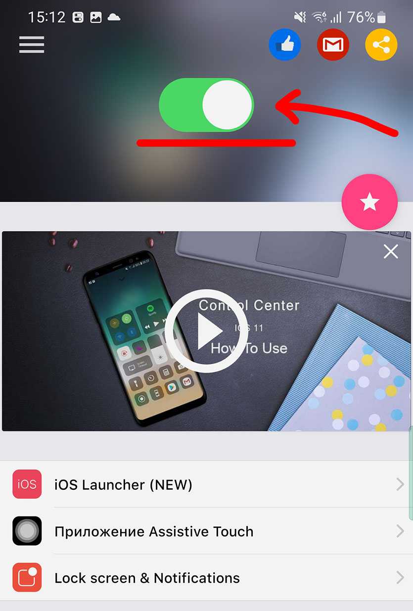 После скачивания Центра Управления в стиле iOS 15 следует зайти в это приложение и активировать его, тапнув по огромному переключателю вверху экрана.