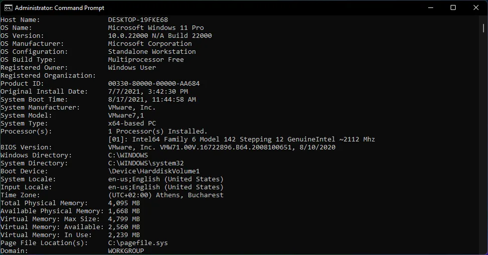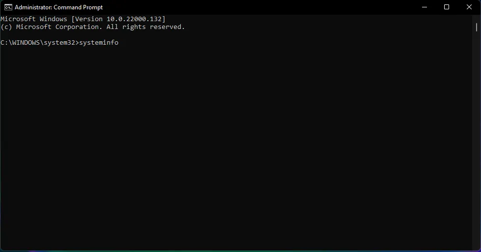 Теперь введите следующую команду systeminfo и нажмите Enter, чтобы запустить ее