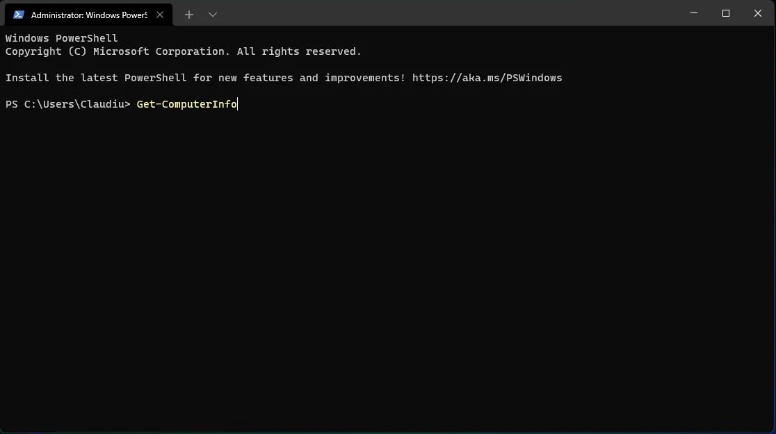 Введите следующую команду Get-ComputerInfo и нажмите Enter, чтобы запустить ее