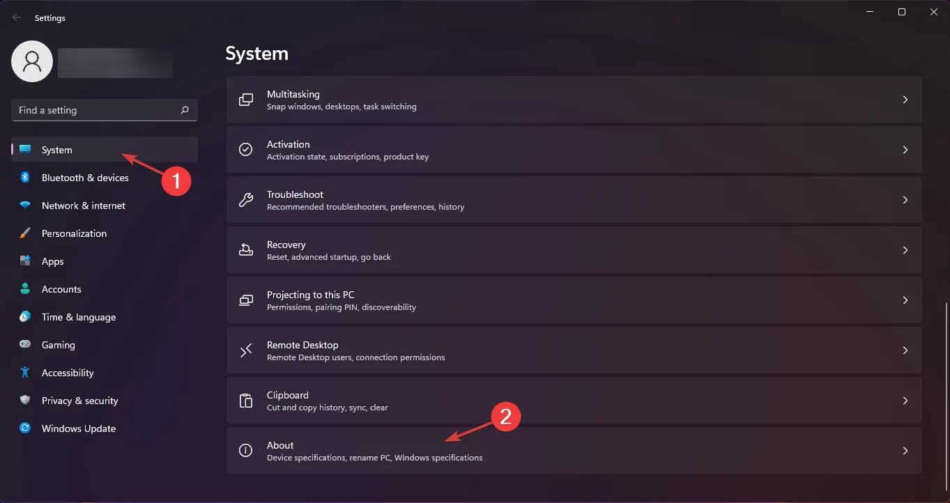 Выберите раздел «Система» на левой панели, а затем выберите параметр «О программе» в правом нижнем углу.
