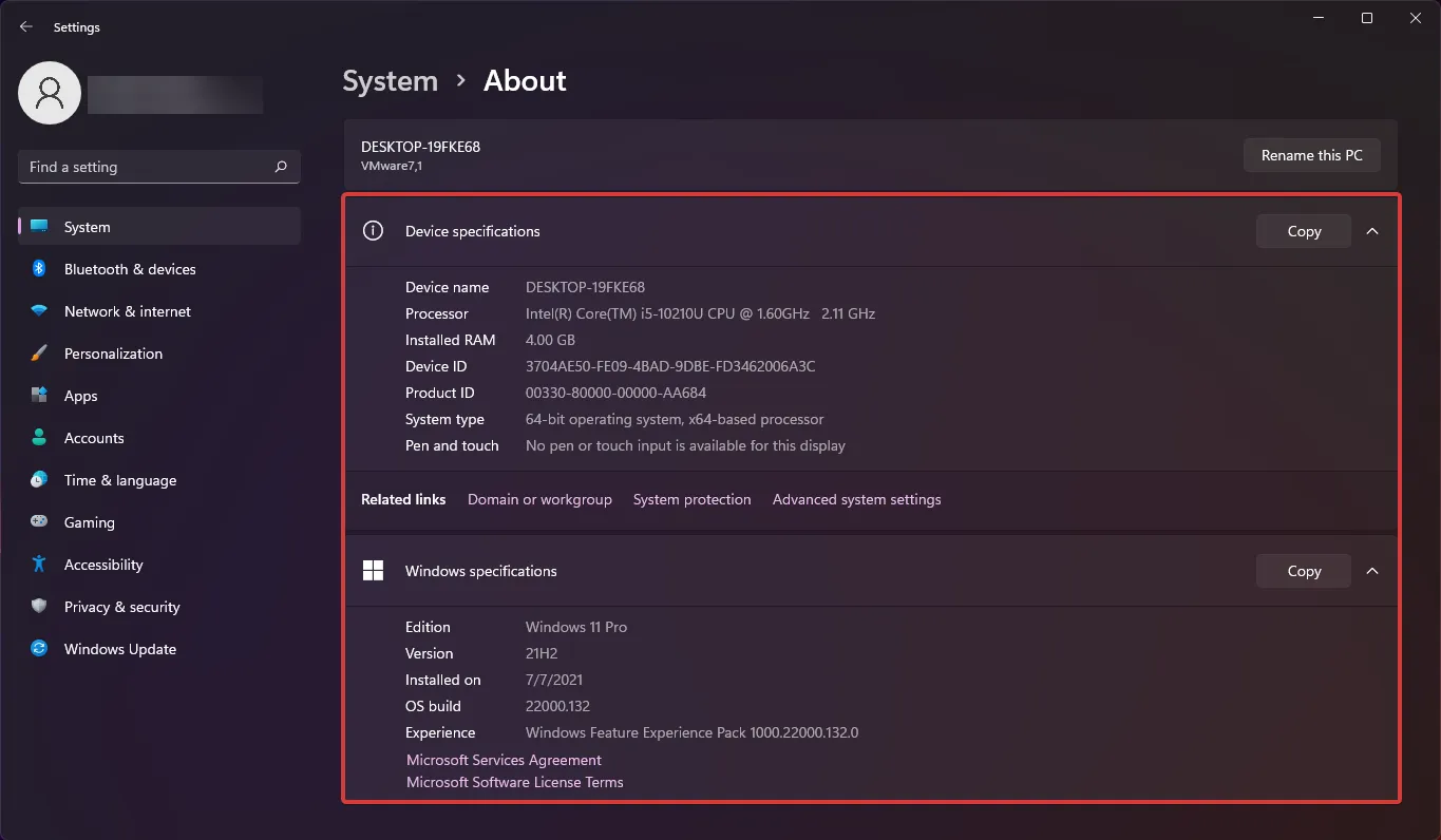 4. Вы можете увидеть все характеристики ПК здесь. Технические характеристики включают данные ЦП, объем оперативной памяти, идентификатор устройства и продукта, тип системы и информацию о версии и сборке вашей ОС.