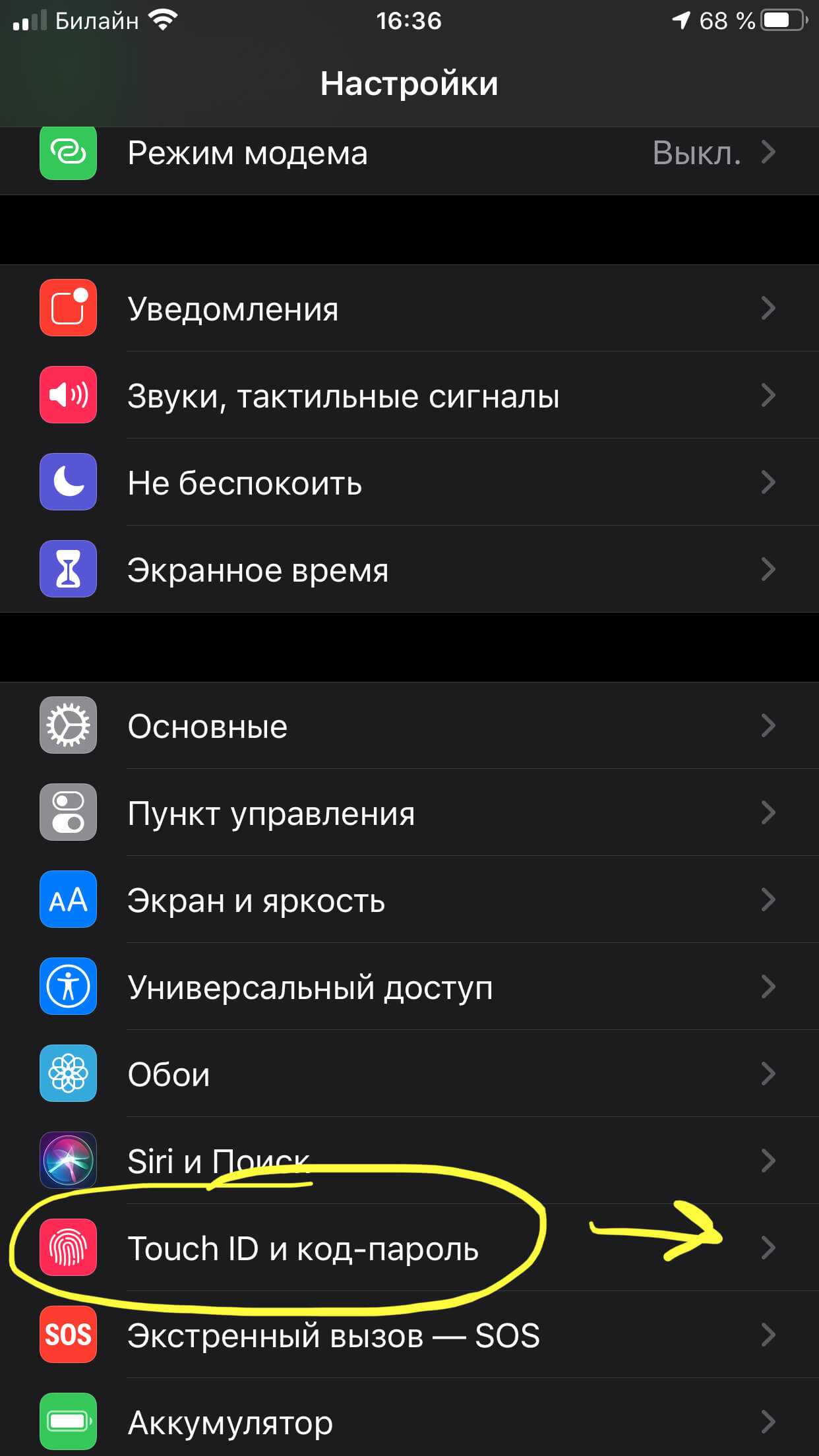 - если девайс имеет кнопку «Домой» — жмём пункт под названием Touch ID и код-пароль.