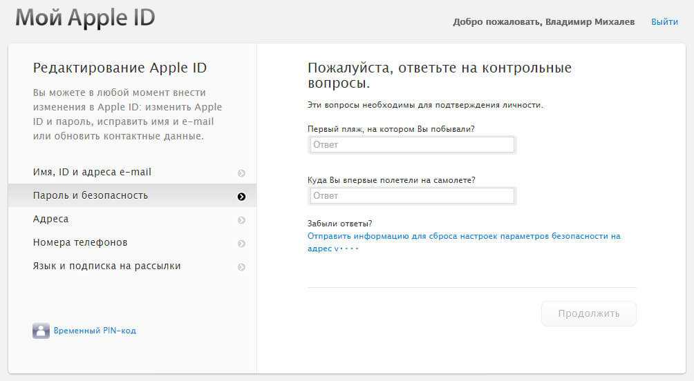 - Затем вам придётся ответить на контрольные вопросы. Также, если в вашей учётной записи используется двухфакторная аутентификация, вам потребуется держать под рукой телефон, чтобы получить на него код для подтверждения личности. Полученный код введите в поле на странице изменения пароля .