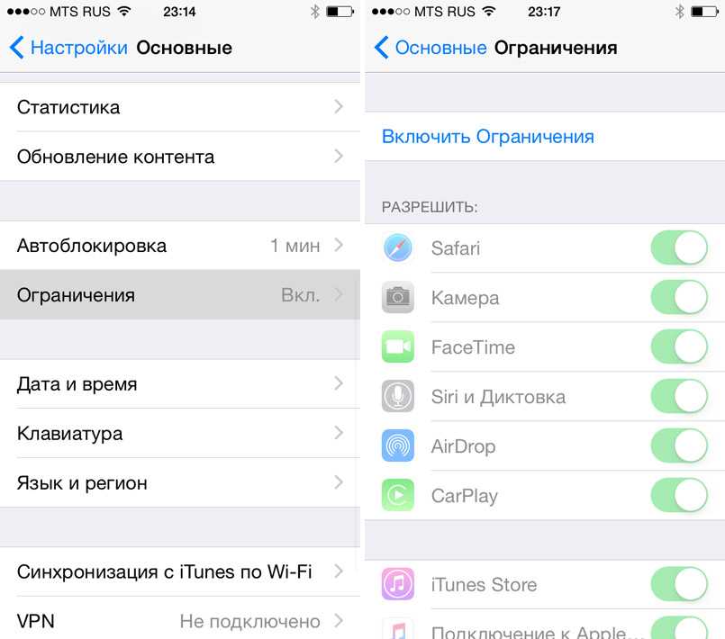 - кликают на ярлык «Настройки», последовательно переходят по пунктам в «Основные», затем в «Ограничения»;