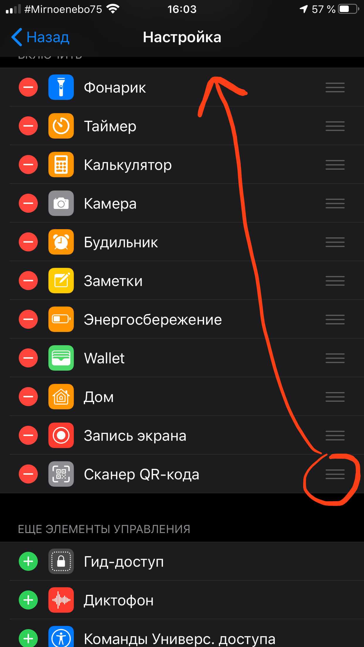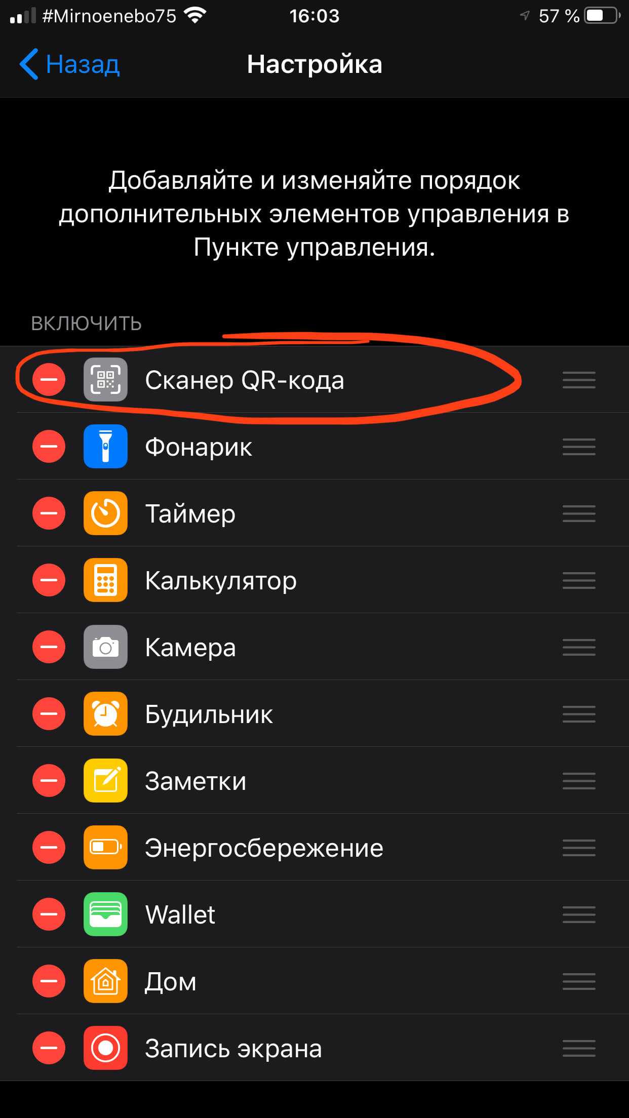Здесь перетащите пункт “Сканирование QR-кода” из неактивного состояния в активное. Для этого надо нажать на плюс около него.