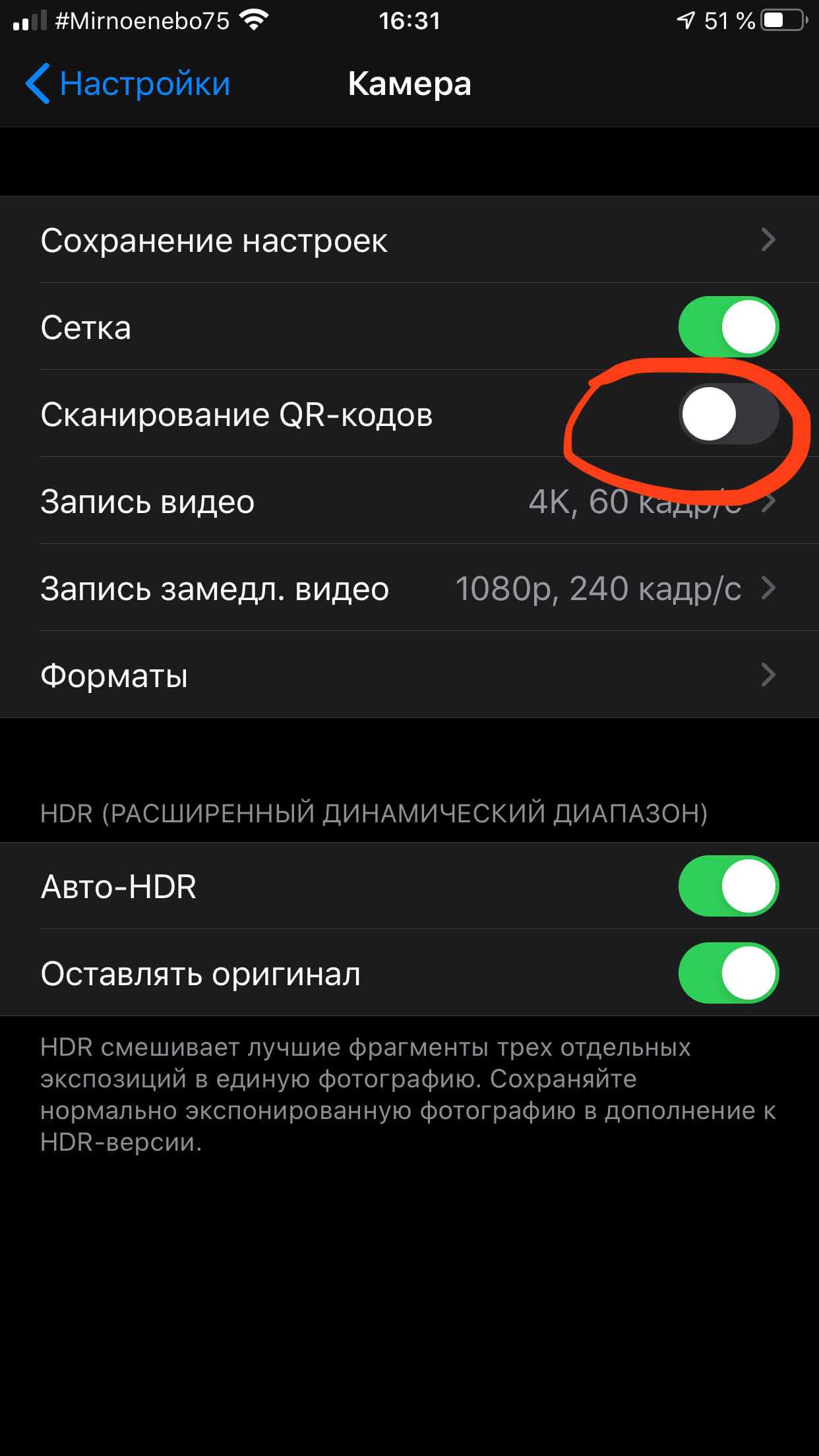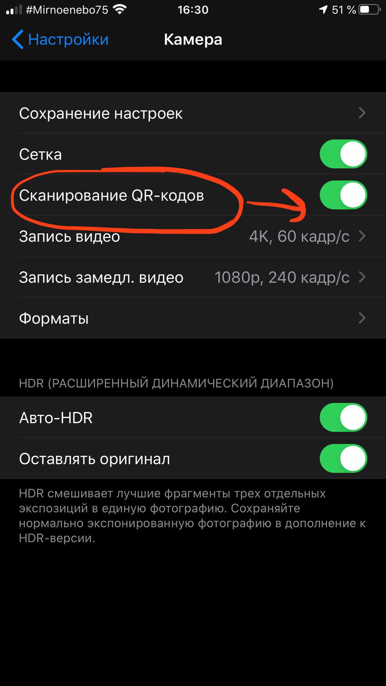 Переключатель в пункте “Сканирование QR-кода” должен быть активирован.