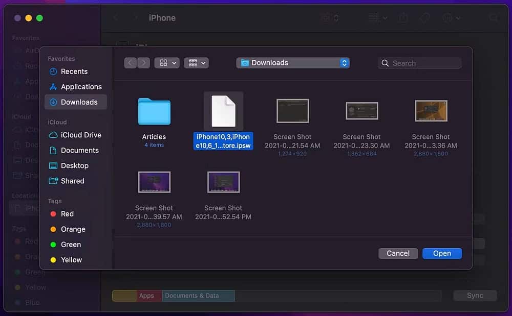 - Вам будет предложено выбрать файл обновления. Найдите и выберите загруженный ранее файл IPSW. Если вы еще не скачали его, перейдите на IPSW.me и получить его сейчас.