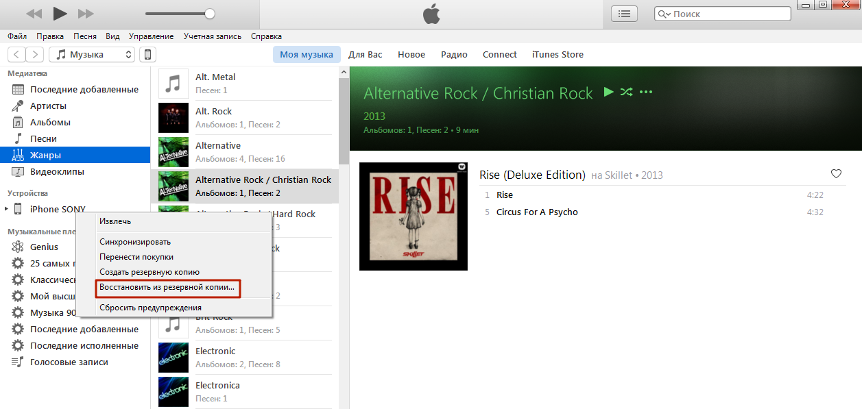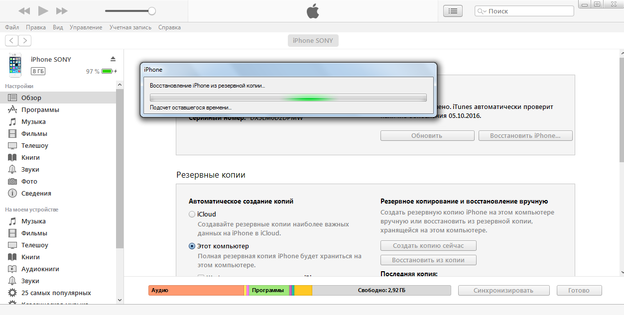Важно! Резервную копию, хранящуюся на компьютере, можно установить на рабочее (используемое) устройство (т.е. с имеющимися данными, включая фото, музыку, приложения и т.д.), при условии, что эта резервная копия была создана с этого iPhone или iPad