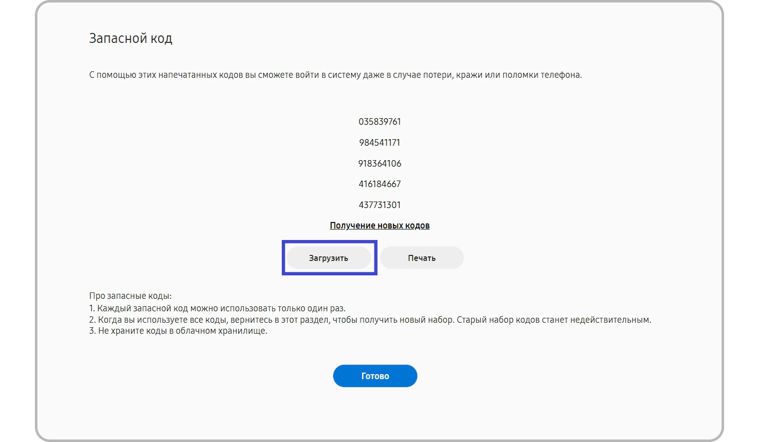 Нажмите «Загрузить», чтобы сохранить резервные коды на свой компьютер.