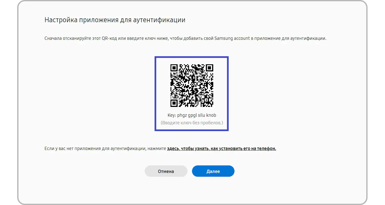 При настройке через браузер необходимо предварительно установить на устройство приложение-аутентификатор (аутентификацию). Далее вам нужно добавить в приложение учетную запись Samsung; для этого отсканируйте QR-код из браузера.