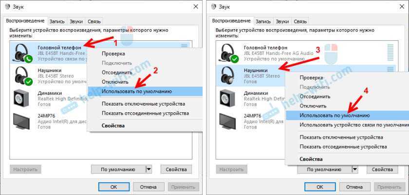 Если у вас не так (понятно, что название наушников будет отличаться), то нажимаем на наушники правой кнопкой мыши и выбираем «Использовать по умолчанию».
