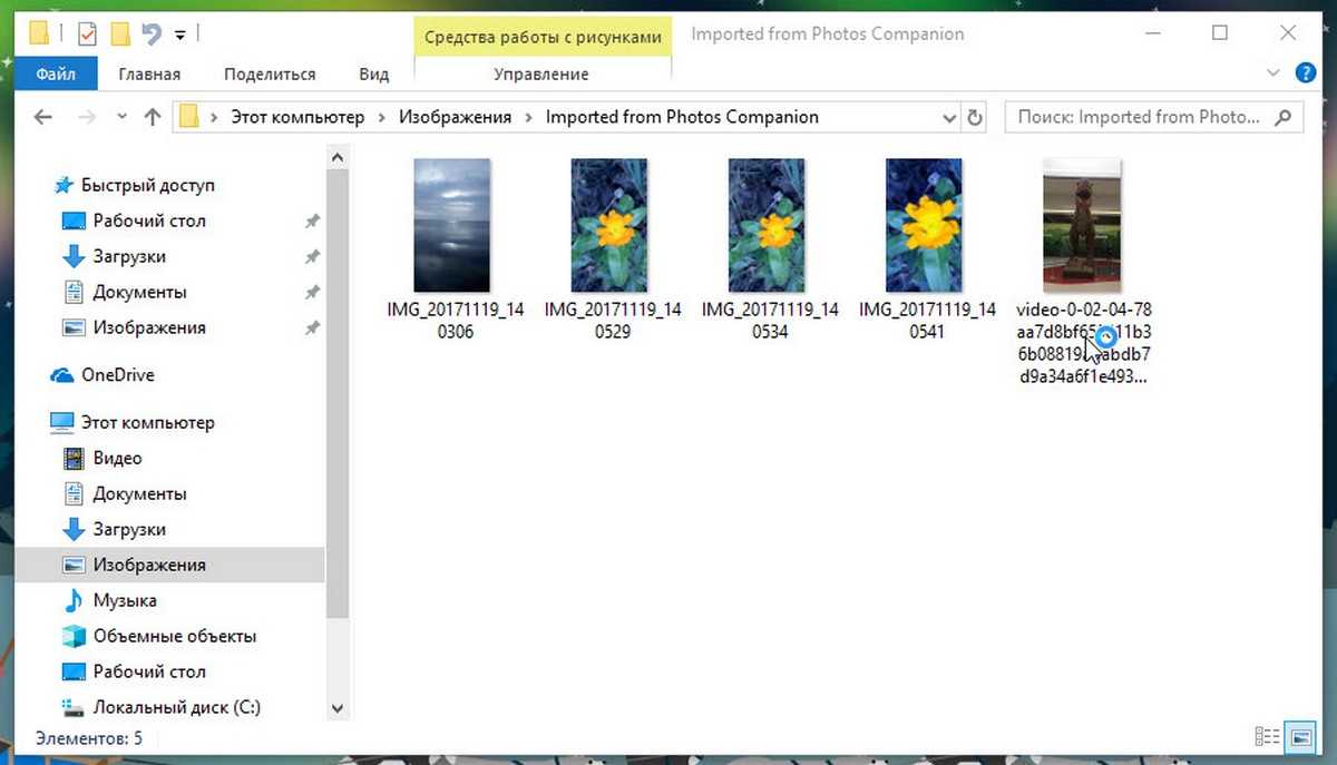 Все переданные фотографии и видео теперь будут отображаться в универсальном приложении «Фотографии» для Windows 10. Их можно найти, перейдя в папку С:\Users\ Имя пользователя \Изображения\ Imported from Photos Companion.