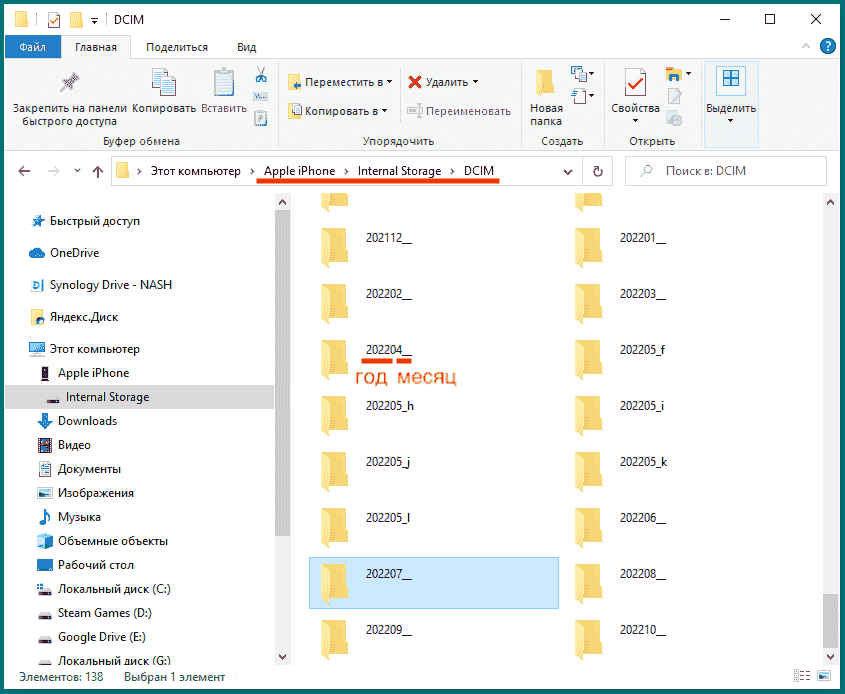 Зайдите в «Internal Storage», затем в папку «DCIM». В зависимости от версии iOS, вы можете увидеть либо одну большую кучу фотографий, либо они будут разложены по разным папкам. В последних версиях iOS (11 и выше), вы увидите большое количество папок, название каждой будет начинаться с обозначения года и месяца, когда была сделана фотография. Например, фотографии снятые в апреле 2022 года, будут находиться в папке, название которой начинается на 202204. Таких папок может быть несколько, если вы много снимали в этом месяце.