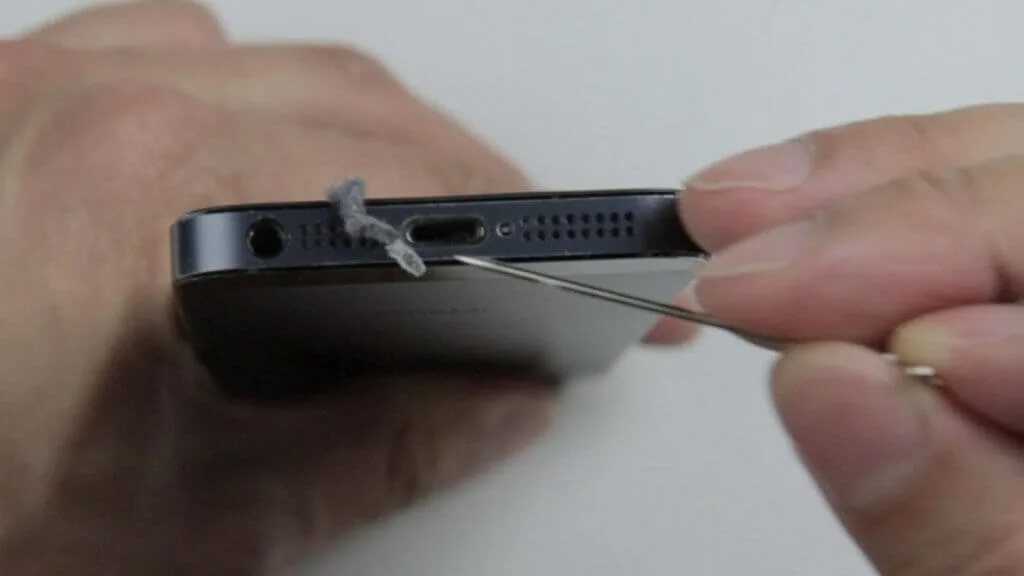 Повернуть телефон отверстием к себе и аккуратно вставить зубочистку между контактами.