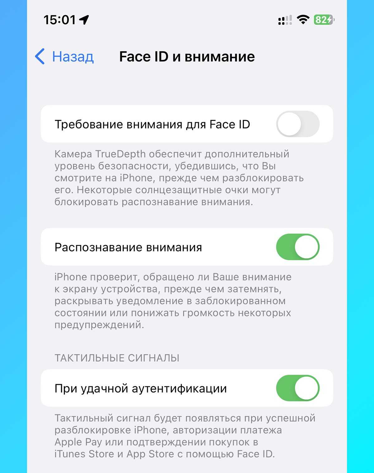 Требование внимания для Face ID – дополнительный уровень защиты, при котором разблокировать iPhone или совершить оплату получится только при зрительном контакте со смартфоном. После включения Face ID может работать хуже для пользователей в очках.
