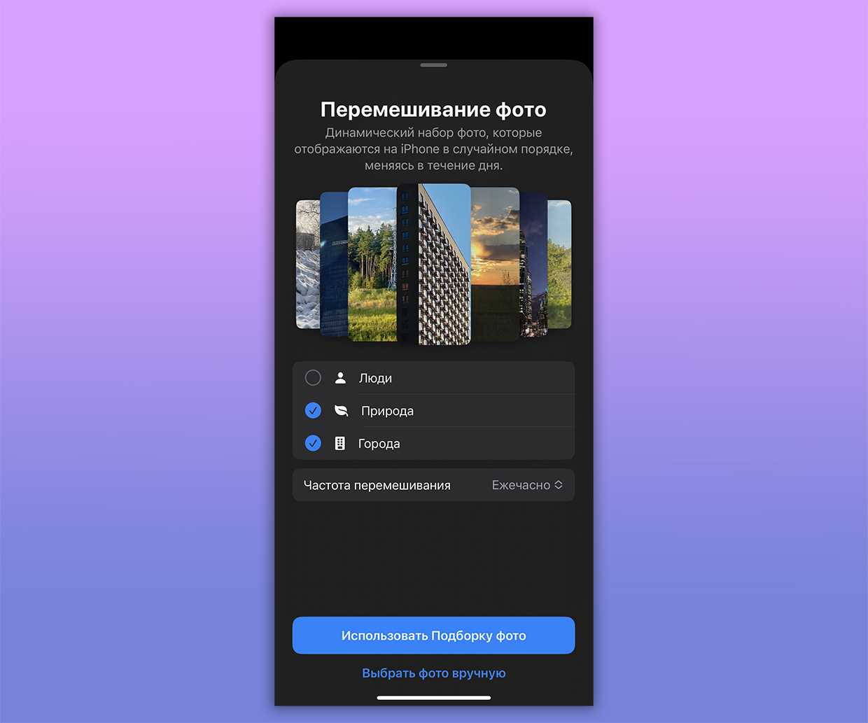 ▮ случайные фотографии из вашей медиатеки Фото. Встроенная нейросеть iOS анализирует данные кадров, сортирует их по содержанию (люди, природа, города) и меняет картинку несколько раз в день. Частота смены снимков настраиваема.