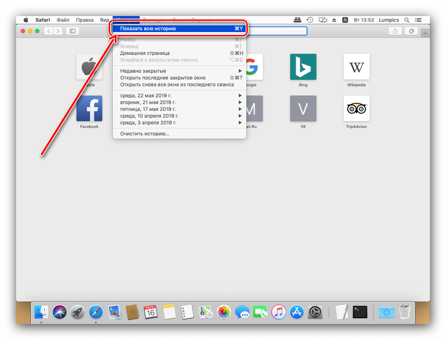 1. Перейдите из строки меню по пути «История» → «Показать историю». Можно также воспользоваться горячими клавишами – ⌘Command + Y.