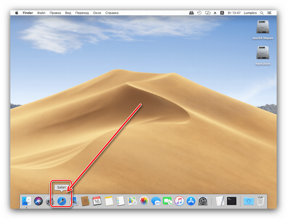- Нажмите значок Safari в доке, чтобы открыть браузер.