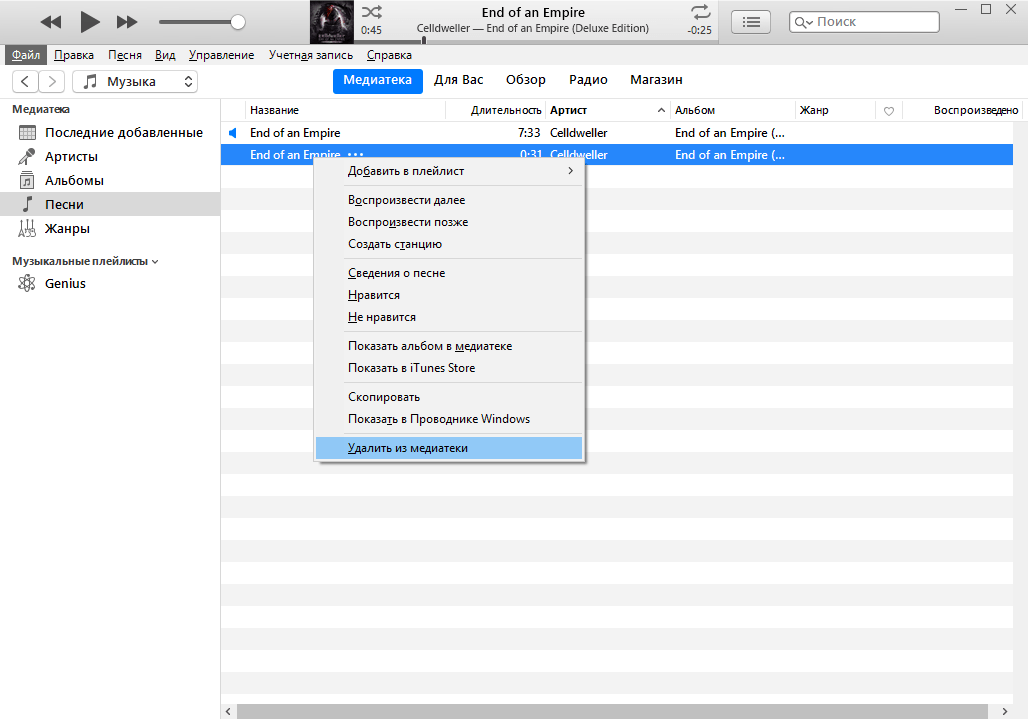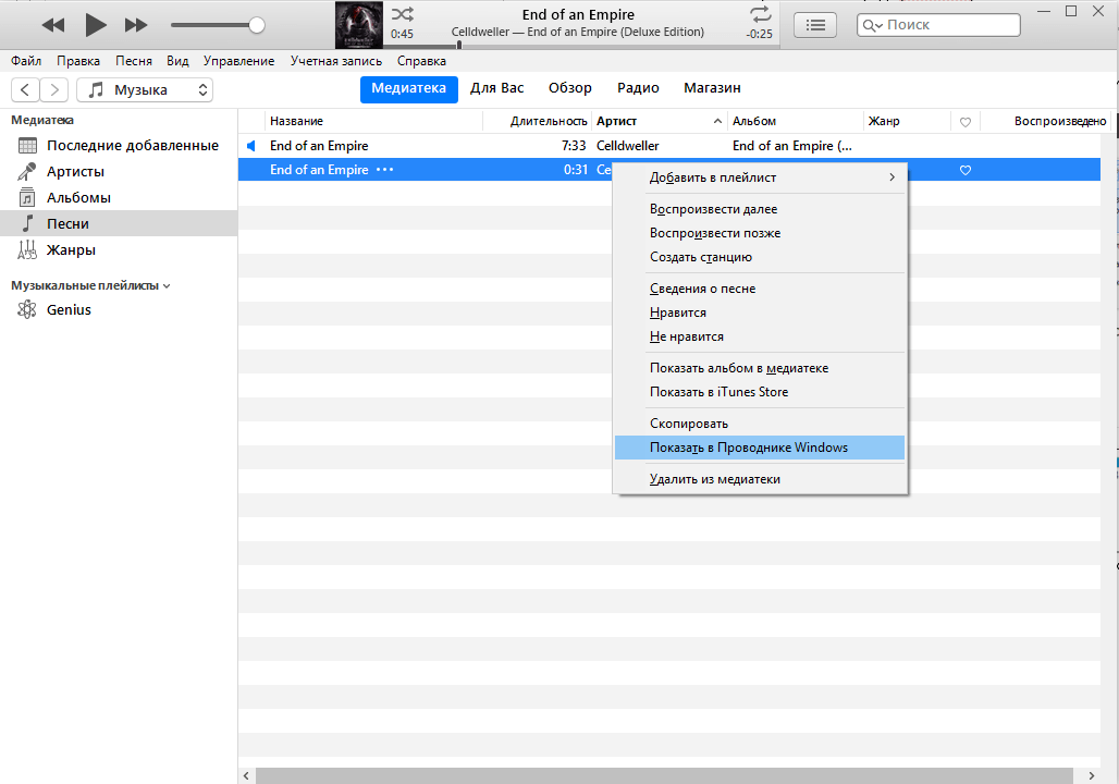 В общем списке песен появится копия трека. Нажмите на него и выберете «Показать в Проводнике». Из открывшейся папки перетащите трек в окно программы iTunes.