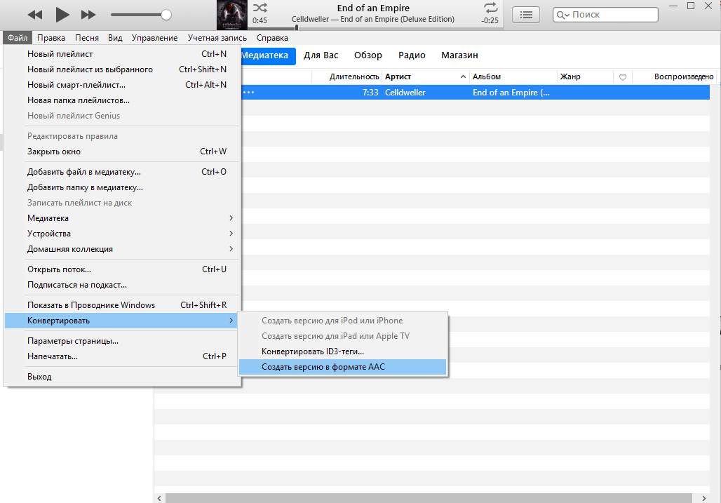 Жмите на «ОК» и конвертируйте эту песню в AAC. Сделать это можно по пути «Файл» > «Конвертация»: