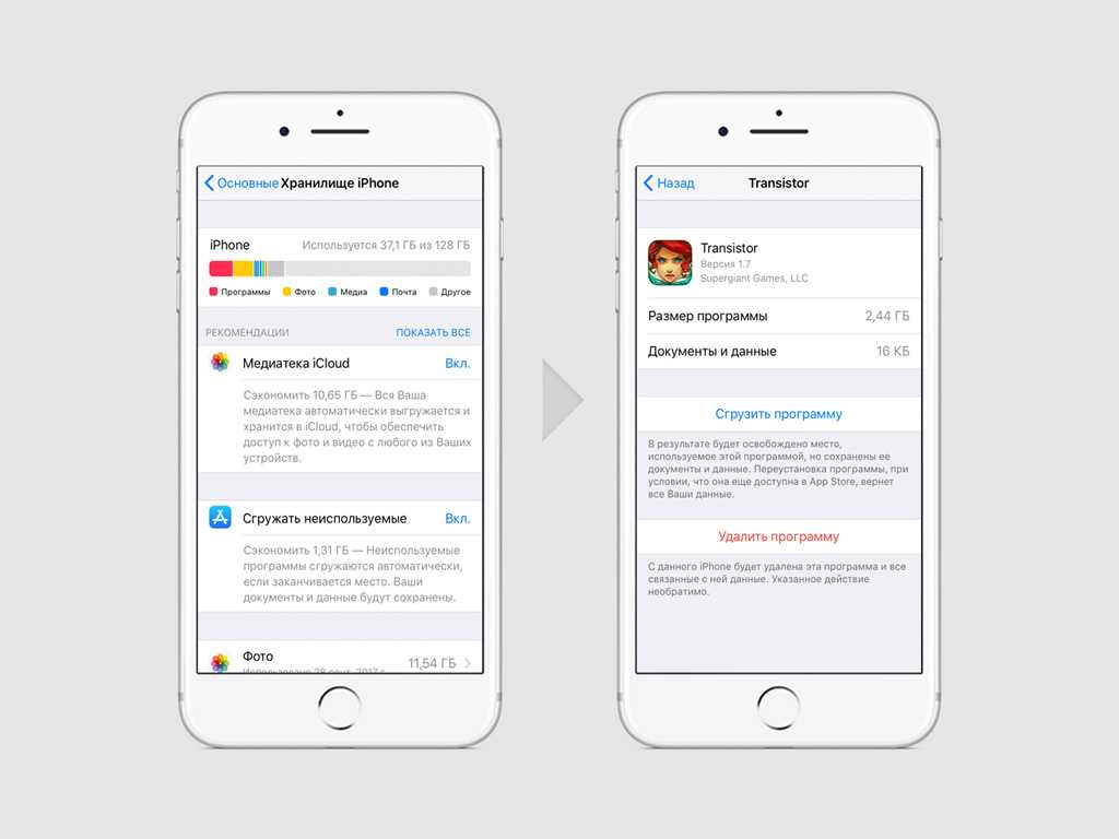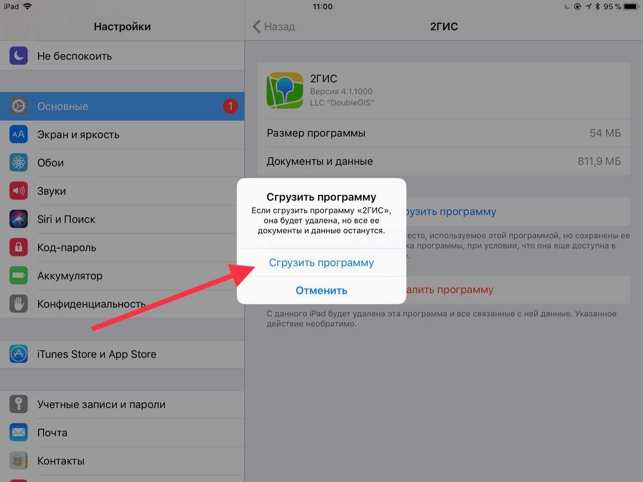 В iOS 11, вместо того чтобы удалять крупные приложения, можно использовать функцию «Сгрузить программу». Она удаляет приложение из памяти устройства, освобождая место, но сохраняет ее документы и данные.