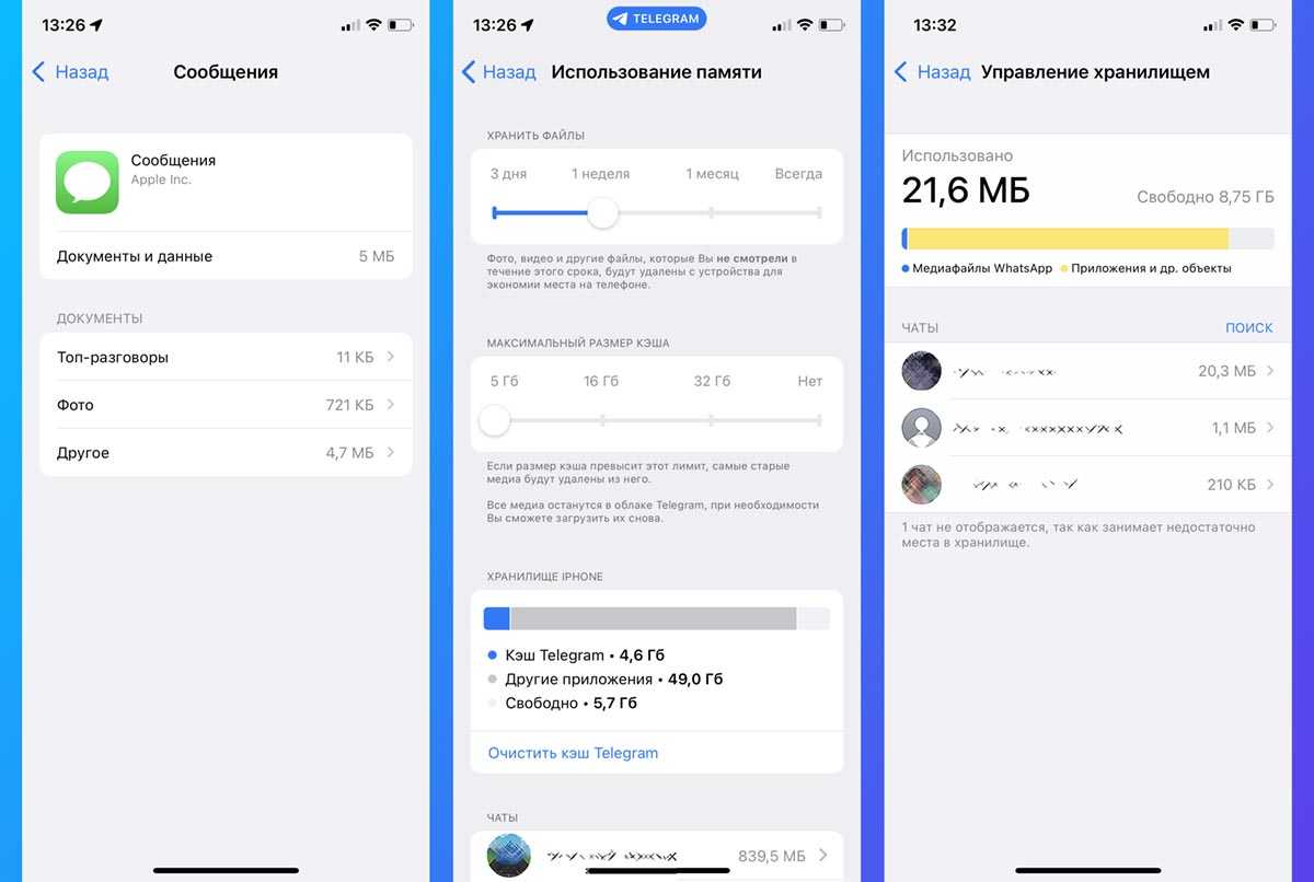 Telegram. Нужно в приложении открыть раздел Настройки – Данные и память – Использование памяти. Здесь можно задать пороговый размер хранимого кэша и вручную удалить накопившиеся данные в некоторых чатах или каналах.
