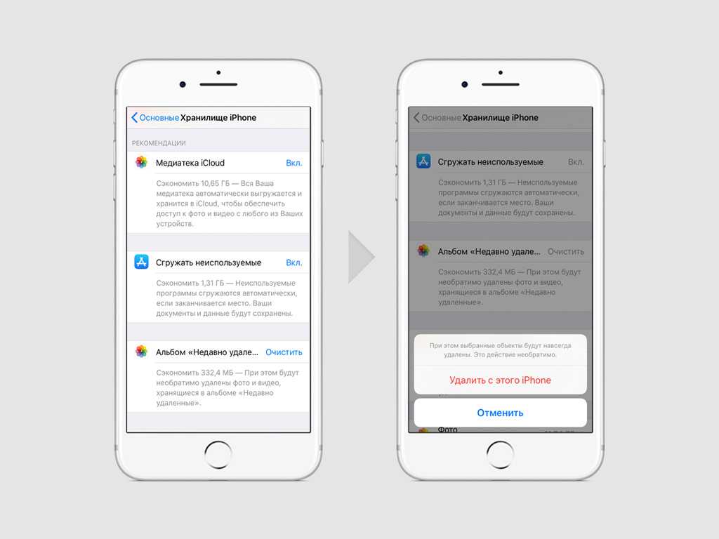 Медиатека iCloud. iOS 11 покажет количество памяти, которое вы сможете освободить, если воспользуетесь этой возможностью. Устройство переместит ваши фото и видео в iCloud. Доступ к ним с устройства останется, но они не будут занимать на нем место.