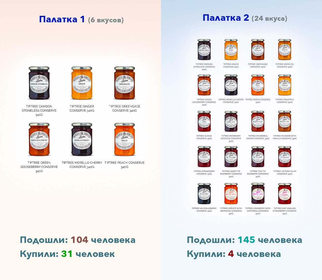 В большом гипермаркете вроде Ашана или Магнита исследователи сделали две палатки для дегустации варенья. Из разных брендов выбрали Wilkin & Sons, потому что у него широкий ассортимент, средняя ценовая категория и он не слишком известен.