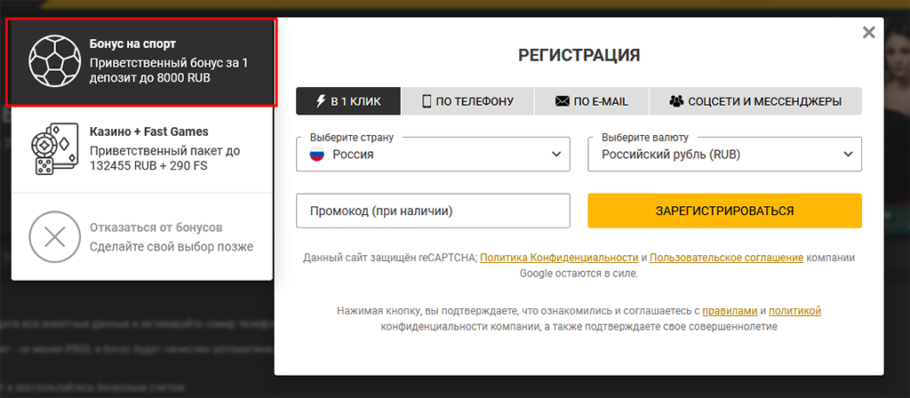 На каком бы портале вы ни решили зарегистрироваться, новым клиентам полагается специальный подарок от букмекерской конторы в виде денежного вознаграждения за первый депозит. У лицензированного в Российской Федерации оператора ставок он называется «Первому игроку приготовиться», а на оффшорном ресурсе беттеры могут выбрать наиболее подходящее поощрение из трех вариантов (все вместе использовать не получится).