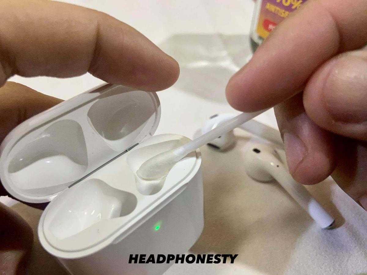 To clean your AirPods and case, you can simply wipe them with a lint-free cloth or paper towel and Q-tips damp with 70% isopropyl alcohol. Focus on the AirPods’ tail and the inside of the charging case.