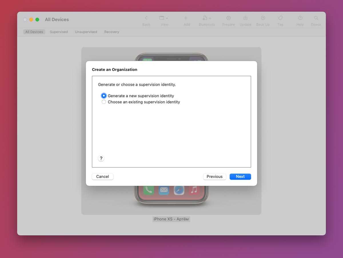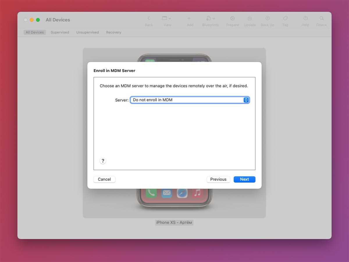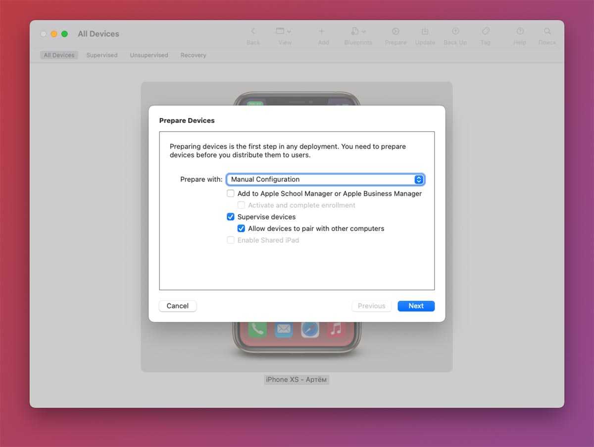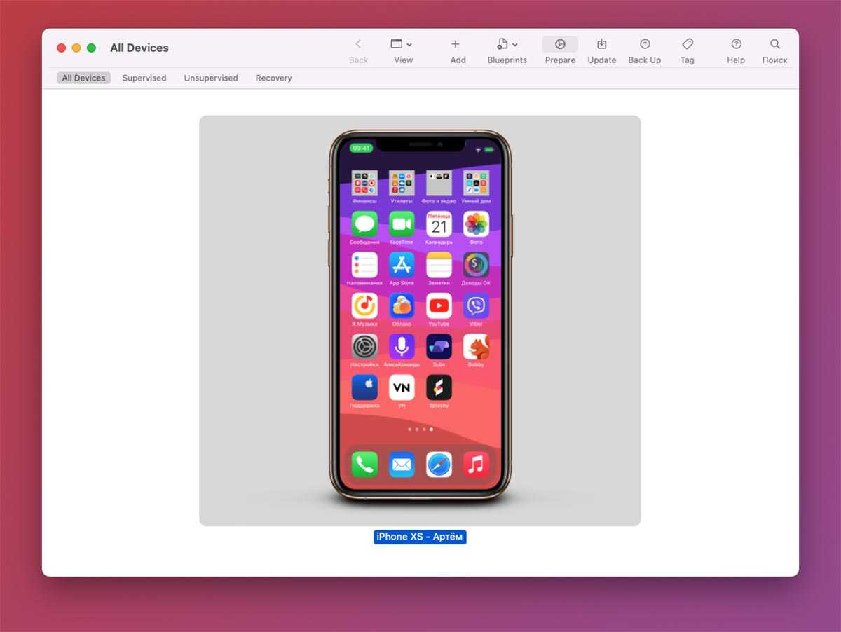 1. Запустите приложение Apple Configurator 2 на Mac и подключите iPhone к компьютеру при помощи кабеля.