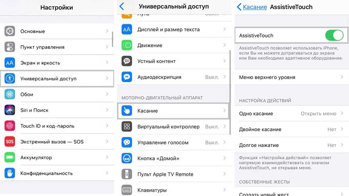 Из-за того, что клавиши расположены на разных сторонах телефона, не всем удобно пользоваться первым способом. Также им не удастся воспользоваться в случае неисправности одной из кнопок. Но компания Apple предусмотрела это и добавила возможность управления телефоном несколькими способами — голосом, при помощи жестов и кнопок. С последней версией операционной системы стало возможным создать жесты и виртуальные кнопки при помощи функции AssistiveTouch. Настроив ее, можно получить в любой момент быстрый доступ к необходимым приложениям и инструментам.