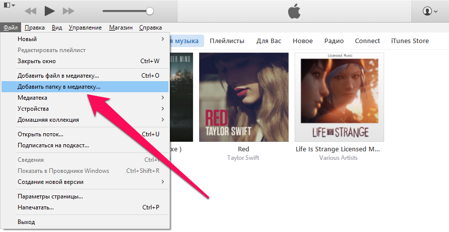 Шаг 3. Добавьте в iTunes музыку, которую вы хотите закачать на смартфон. Для этого нажмите «Файл» → «Добавить файл в медиатеку» для открытия определенной песни или «Файл» → «Добавить папку в медиатеку» для добавления папки с музыкой. iTunes поддерживает Drag’n’Drop, что позволяет просто переносить отдельные песни и папки с музыкой в окно программы для добавления.